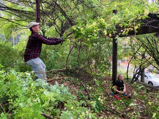 Paul Freda prunes and Peter Warrington fills the truck.